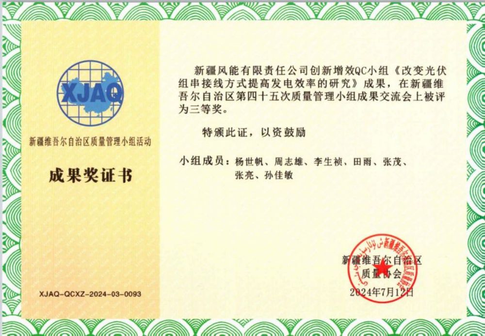 此次交流會風(fēng)能公司提交了三項Q C課題成果,與來自全疆各地的289個優(yōu)秀項目同臺競技。歷經(jīng)專家評審團的嚴(yán)格考察與綜合評定,最終,公司榮獲“表現(xiàn)突出集體”的稱號。其中“改變光伏組串接線方式提高發(fā)電效率的研究”項目喜獲三等獎,成為公司質(zhì)量管理與技術(shù)創(chuàng)新征程上一座新的里程碑。